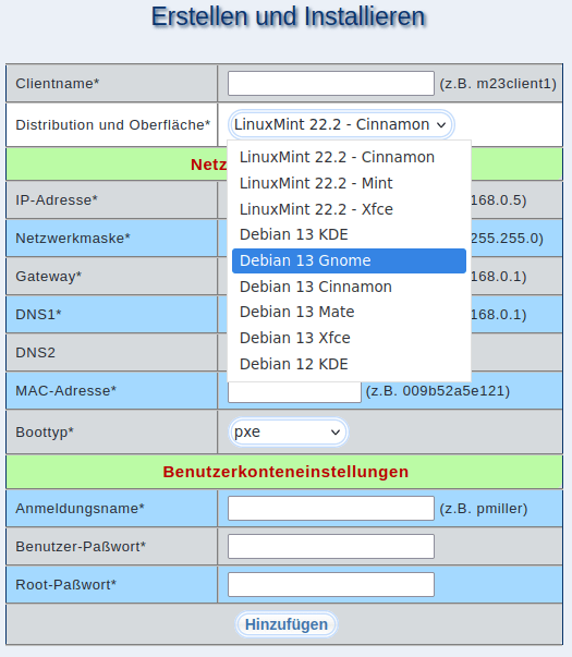 First, you need to enter some values for the client. These are, for example, the network settings (IP, networkmask, etc.), user name and password or an authentification server (LDAP, FreeIPA or UCS) that manages your user accounts.